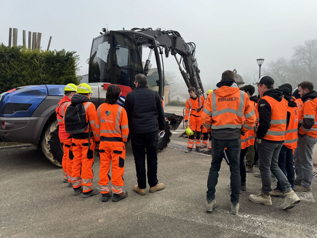 Le Groupe HBI, à travers sa filiale Framateq Rhône-Alpes, a récemment organisé une journée au CFA-UNICEM de Montalieu-Vercieu autour de la Mecalac e12, pelle sur pneus 100 % électrique fabriquée en France. Plus de 50 jeunes en CAP conduite d’engins ont participé à cet événement mêlant présentation technique, démonstration dynamique et essais en conditions réelles.