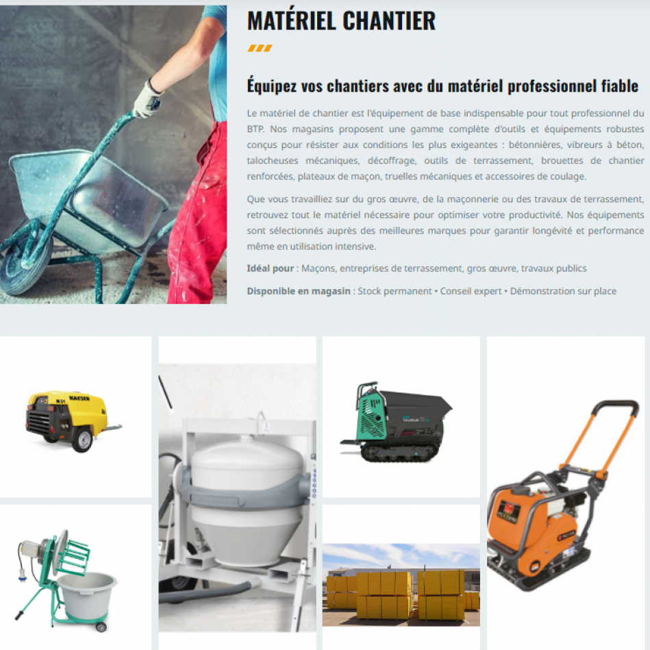 Livraison sur chantier, conseil expert en magasin, commerciaux itinérants, SAV avec réparation de machines, démonstrations produits : le nouvel onglet met en avant tous les services qui font notre différence au quotidien.