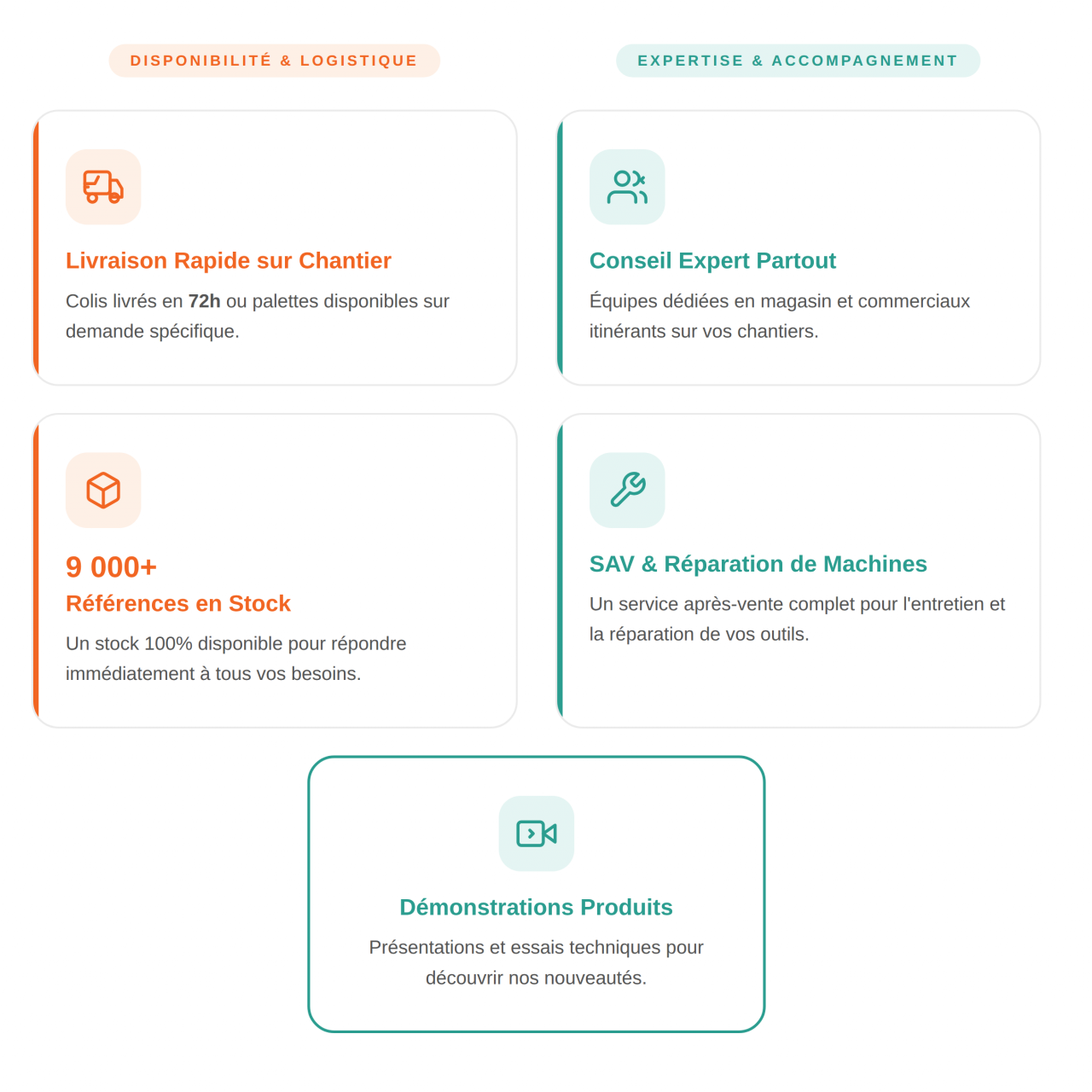 Nos équipes sont des professionnels du terrain qui connaissent les métiers du BTP de l'intérieur. En magasin, vous bénéficiez d'un conseil personnalisé sur le choix du matériel, les marques, les normes et les bonnes pratiques. Pas de script commercial : une vraie discussion entre pros pour trouver la solution adaptée à votre situation.