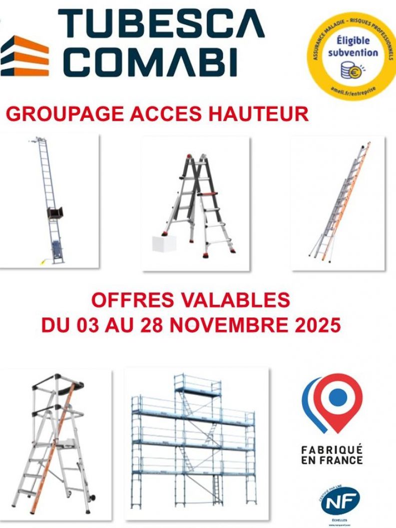 Vos enseignes Locamuc, filiales HBI Groupe, vous proposent une opération promotionnelle exclusive sur la gamme complète accès hauteur de Tubesca-Comabi, leader français reconnu depuis plus de 70 ans pour la qualité et la fiabilité de ses équipements.