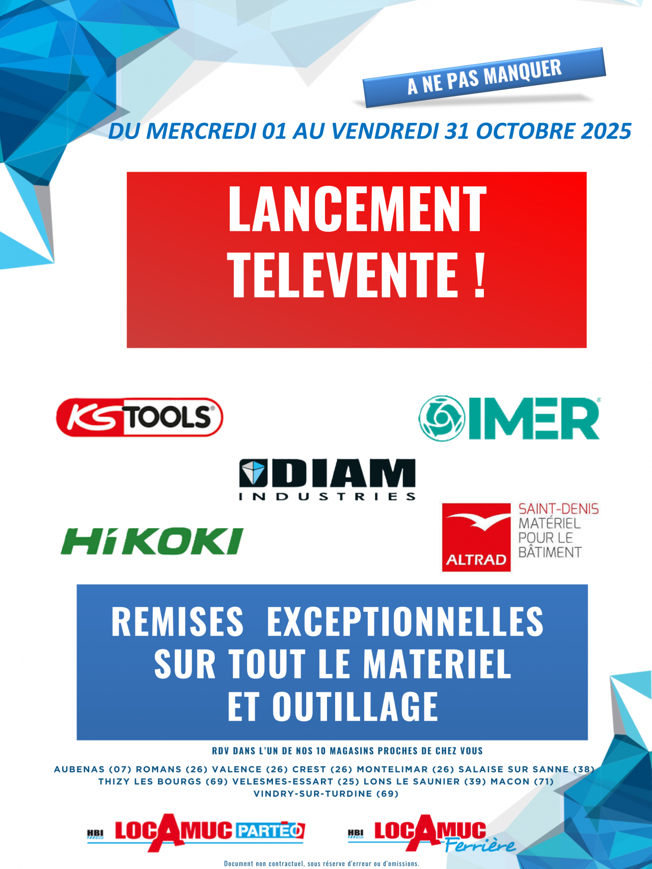 🚀 Votre Télévente d'ocotobre arrive ! 🔥Du 01 au 31 octobre 2025, profitez d’une opportunité unique pour vous équiper avec du matériel et de l’outillage « premium » à des prix incroyables !